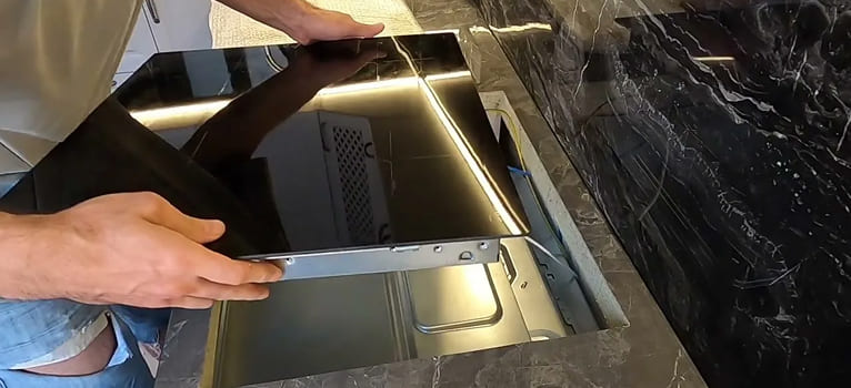 Варочные панели AEG крепятся к столешнице снизу, с помощью монтажных кронштейнов (зажимов). Они расположены по углам панели. Чтобы до них добраться, нужно попасть в пространство под столешницей.
